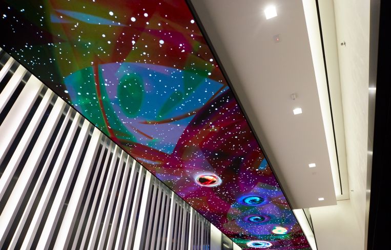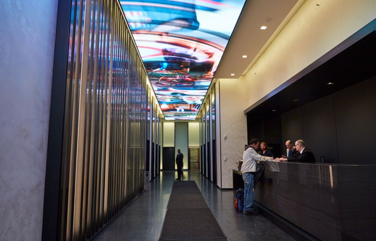 What his company came up with is a large screen that spans the majority of the ceiling in the lobby and shows a vibrant array of colors and images. The 75.7-foot-long and 7.8-foot-wide LED screen, created by VER, alone cost $2.5 million of the $21 million building renovation. It will be officially revealed at an event this week. The high definition screen displays 6.7 million pixels and functions with two processors.