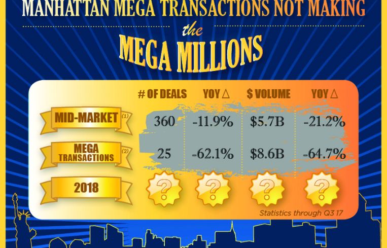 The New York City investment sales market has had about as prosperous a return this year as most people have from scratch-off Lotto, relatively speaking. With only $24.3 billion of investments for all property types, dollar volume is down 46.9 percent year-over-year. This trend is precipitated by an even steeper decline in Manhattan investments, which are down 54.6 percent compared with one year ago with only $14.4 billion traded. At this pace, Manhattan investment sales are on pace to finish 2017 at the lowest level since 2010, when dollar volume only reached $11.8 billion.