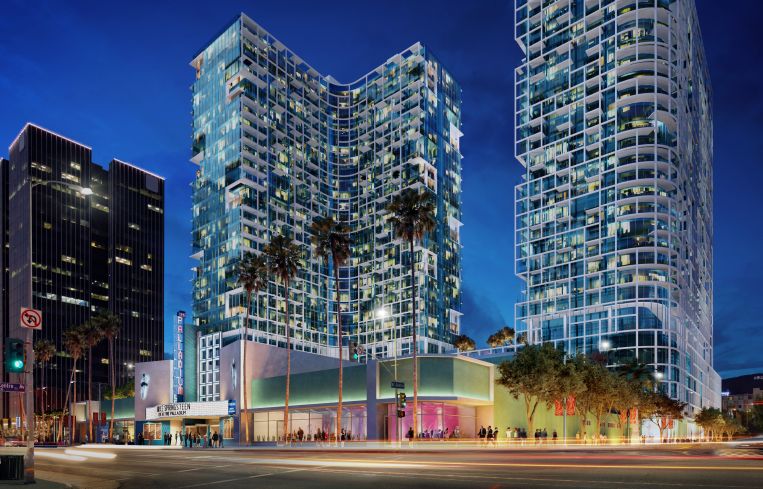 The two-tower development preserves the iconic landmarked theater it neighbors, which was built in 1940. The venue is currently leased to Beverly Hills-based events operator LiveNation through 2027.
