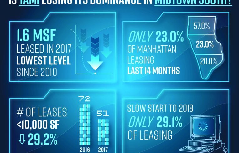 And it is not just within Midtown South that TAMI tenants are losing their supremacy. In 2015 and 2016, Midtown South TAMI tenants accounted for 31.1 percent of the total leasing for that sector throughout Manhattan. But that average has dropped significantly over the past 14 months, as TAMI leasing activity in Midtown South only accounted for 23 percent of the total TAMI demand in Manhattan.