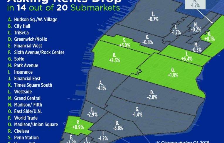 The first quarter of 2018 came to a close for the Manhattan office leasing market, and it was still more of the same. Despite a 10-basis-point drop in the overall vacancy rate to 8.8 percent in the first quarter, overall asking rents dipped $0.12 per square foot to $72.13 and new leasing activity totaled slightly less than 7.1 million square feet—a 7 percent year-over-year decline. Although overall average asking rents dropped minimally, the bigger trend was that they declined in 14 of the 20 submarkets during the first quarter.