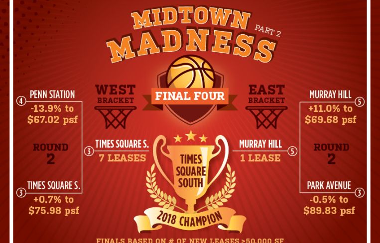 For the first time ever, the fifth-seeded Murray Hill made it to the finals from the East region, and will try to upset the third-seeded Times Square South submarket from the West region. The finals will be decided by the number of new leases signed greater than 50,000 square feet over the last 12 months. Times Square South recorded seven leases of this size, led by six leases greater than 100,000 square feet. Murray Hill’s Cinderella story comes to an end during the finals with only one new lease completed in the last 12 months greater than 50,000 square feet. This results in Times Square South winning the 2018 Midtown Madness Tournament!