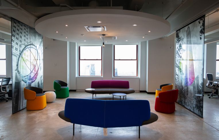 The company’s logo of red, yellow, green, purple and blue dots is proudly displayed in a few ways throughout the office: backlit dots on the reception desk and circular carpets under a row of high-back chairs facing windows with views of Midtown South and Downtown.