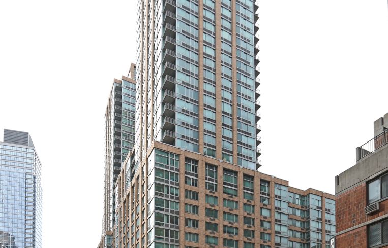 Built with frontage along West 64th Street as well as West End Avenue, the sprawling 35-story apartment tower stands blocks from the Hudson River and from Lincoln Center, and directly across from a full-block park with a playground.