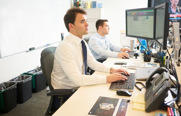 Once breakfast is cleared, Finan heads upstairs to the smallish, bullpen-style office that CBRE’s entire brokerage team shares. Even Tom Traynor and James Millon, the pair of former Deutsche Bank financiers who led the team through $5.1 billion of business in their first year or so at the helm, share the room with Finan and their four more junior staffers, sitting behind Bloomberg terminals with views looking north from East 45th Street. Traynor, Millon and Finan used to sit in separate offices, but they called each other so often throughout the day that they decided proximity would be far more convenient.