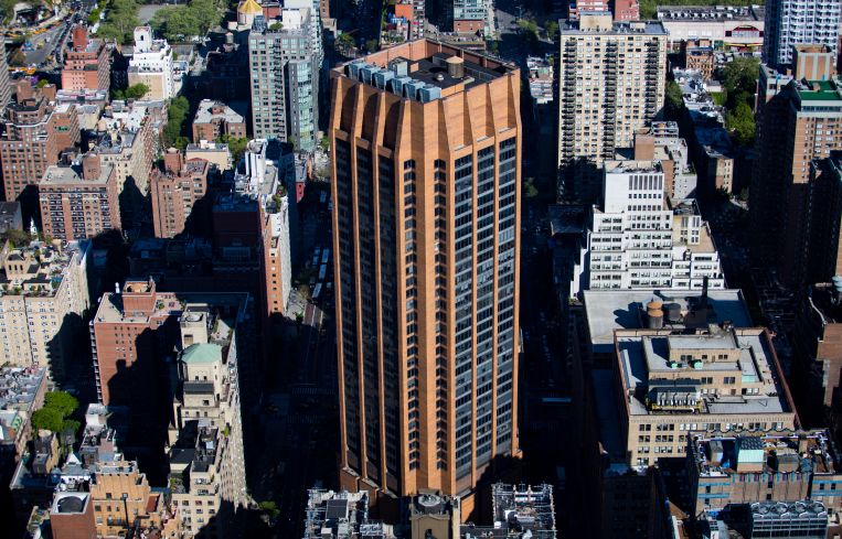 The building’s brick facades and blunt geometry—aligned diagonally on the western half of the block bounded by Park and Lexington Avenues and East 33rd and East 34th Streets—recall the castle-like armory for the 71st Regiment of the New York National Guard that stood at the address before the current structure went up in 1973. Current office tenants in the nearly 950,000-square-foot tower include outdoor advertising firm JCDecaux, printer Mimeo, and TransPerfect, which provides translation services to businesses.