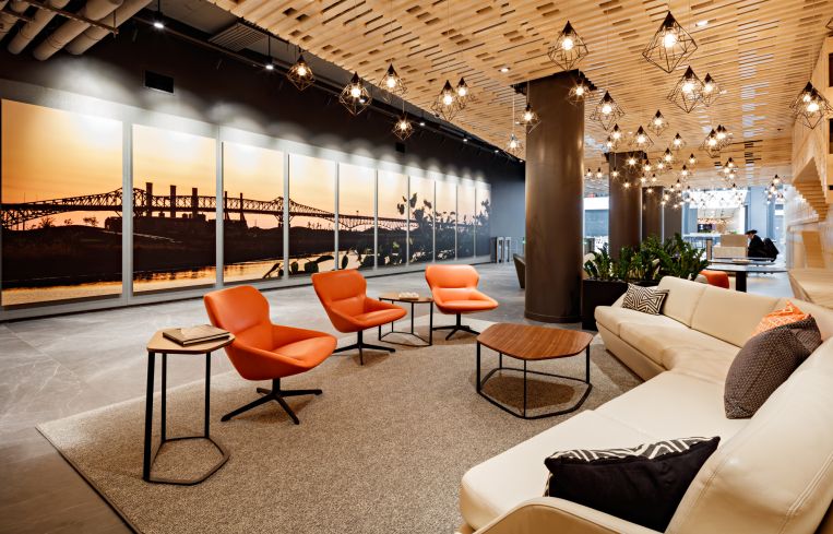 The reimagined Harborside neighborhood blends premier offices, luxury living, locally-inspired shopping and dining, and new public spaces for the community. Within its office properties, Mack-Cali recently completed significant enhancements to the building lobbies, highlighted by new pedestrian routes with built-in lounge areas that have been refinished with a raw industrial aesthetic that pays homage to Harborside’s industrial past. Features include dark metal finishes that directly reference the railroads and intricately detailed wood planks that reference the shipping piers. Glass walls at the elevator banks now provide increased natural light and spectacular views of the Hudson River and New York City.