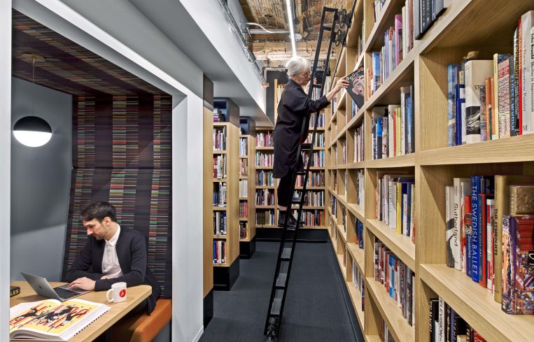 For Global Brands Group, Spacesmith created a loft-inspired space with exposed ductwork, polished concrete floors, gray walls, exposed concrete columns, dark wooden tables and brown and white leather chairs. Similarly, for Abrams, the 21-year-old firm exposed vaulted brick ceilings, created over 600 feet of shelving and book displays, built out a bright white kitchen with black countertops, and designed reading nooks wallpapered in book-inspired motifs.