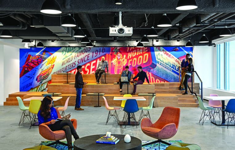 The office café incorporates a wide variety of seating, including dark leather and wood booths, brightly colored plastic chairs, Eames chairs and wooden stools and bleachers. Behind the blonde wood bleacher seats is a blown-up photo of the Nathan’s Famous hot dogs sign in Coney Island, Brooklyn. Other rooms have photos of the now-demolished 5 Pointz warehouse complex covered in graffiti, the green and gold ceiling of Grand Central Terminal, and a picturesque stretch of Brooklyn Heights.