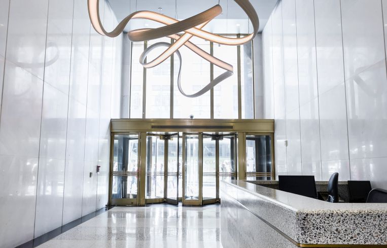 In the lobby, Kaufman opted to keep the original marble walls and terrazzo floors. The classic Art Deco entrance, with its bronze framing, revolving door, black marble pillars and bronze lamps, has also been kept. However, a new Mobius strip-shaped bronze chandelier created by Design Republic hangs in the entryway, there’s a new black-and-white granite security desk, and bronze turnstyles were installed last year.