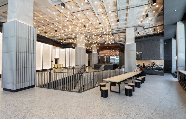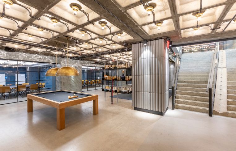 And so, it recently spent $55 million to renovate the building between West 31st and West 32nd Streets, adding a new lobby, a small amphitheater for tenants and a large underground amenity space. The new lobby, designed by Nelson Architects, features long, white bulbs from floor-to-ceiling along one wall, exposed concrete columns and a concrete waffle ceiling, modernist chandeliers lit with exposed incandescent bulbs and a glass-enclosed, 100-person amphitheater with large wooden stepped seats. There’s also an open staircase leading down to the 15,000-square-foot basement recreation space, which consists of a lounge with pool tables, arcade games and couches, along with two conference rooms and a gym. In addition, the subterranean spot has a large bike room, showers and locker rooms.