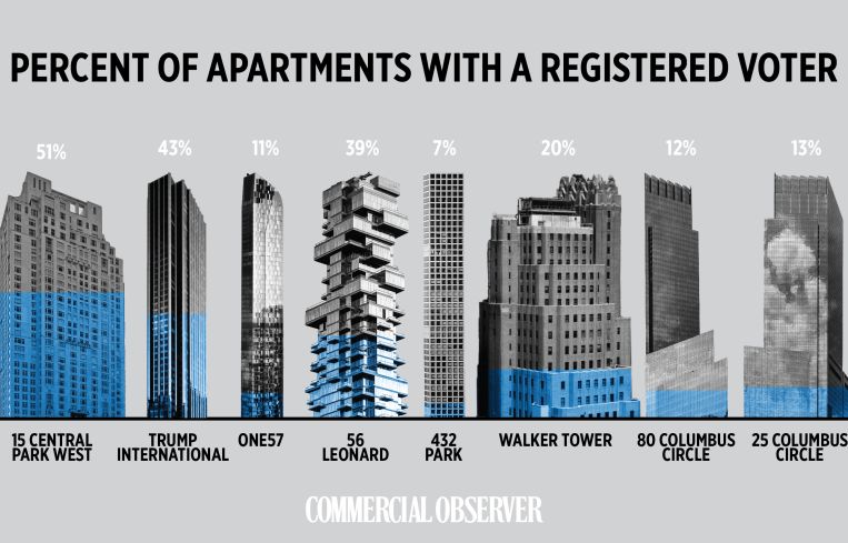 The proportion of apartments with at least one registered voter in each of the eight towers, which rank high up on City Realty’s list of luxe buildings in the city, is far less than that.