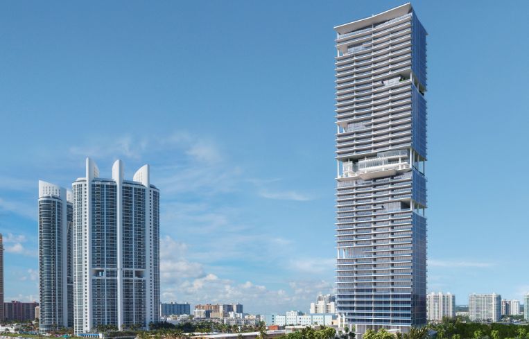 The 54-story glass condominium tower, at 18501 Collins Avenue, includes 154 waterfront residences with ocean and bay views. The property boasts 70,000 square feet of amenities across six levels, including the three-level Sky Club on floors 30 through 32. The club comprises a ‘sun and swim’ level, with sunrise and sunset swimming pools and two hydrotherapy spas; a ‘fitness and spa’ level with an oceanfront open-air gym and pilates studio; and a dining level with a catering kitchen and sunset lounge.