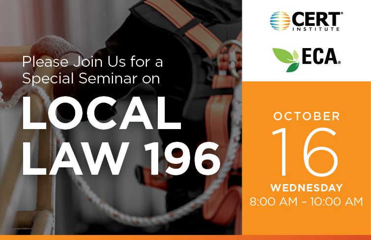 Please join the Environmental Contractors Association (ECA) and CERT Institute for a special, expert-led seminar and training discussing Local Law 196, environmental remediation and how you can avoid risk and liability on the job site. The seminar will discuss the new guidelines set forth by Local Law 196, as well as the key OSHA policies, procedures and standards your staff needs to be aware of. The presentation will also highlight environmental training now available for effective on-site remediation required for a broad range of hazardous environmental and infectious public health emergencies.
