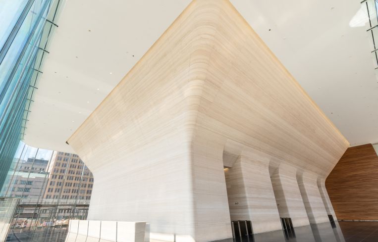The entire facade is wrapped in floor-to-ceiling glass, but the interior sloped walls of the lobby are clad in 400 tons of white travertine marble, transported by boat from an Italian quarry. The stoneworkers had to buy three CNC machines — computerized milling machines run on the same technology used by 3D printers — in order to carve the shape of the four-story-high walls and line up the veins in the marble, according to Kanner. The marble also continues into the elevator lobby, which looks like a long, horizontal chute carved out of the middle of the building’s core.