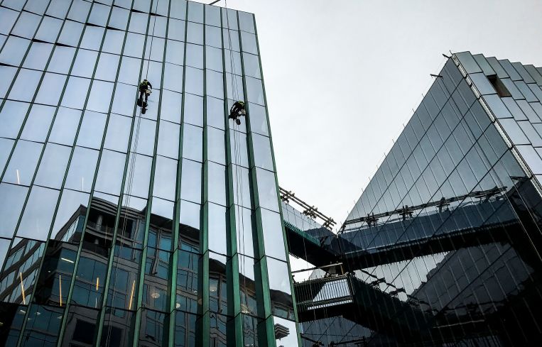 Completed in 2018, the 868,000-square-foot complex consists of a pair of glass-curtain-walled towers connected by both a common base and by sky bridges. The property includes on-site parking, a fitness center and ground-floor retail space that flows into an outdoor plaza.
