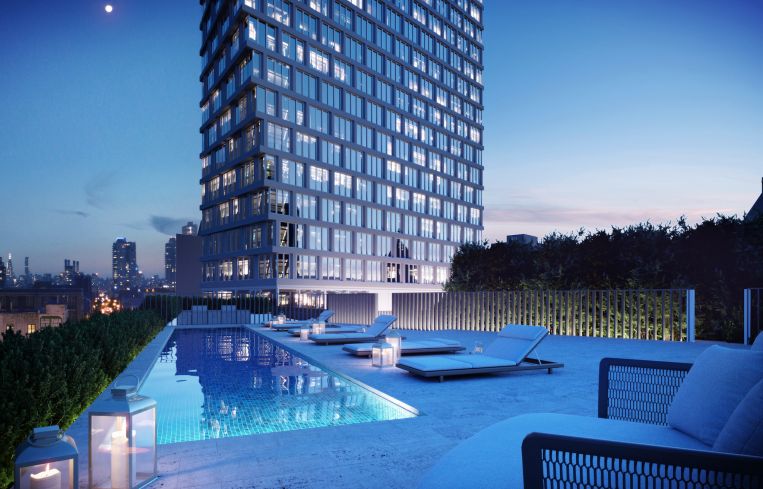 The Morris Adjmi Architects-designed residential tower — at the corner of Clinton Avenue and Atlantic Avenue, a bustling stretch of road in Brooklyn — will have retail on the ground floor, coworking space managed by Hope Street, and a landscaped rooftop. It will also feature a gym, a game room, and a lounge as well as an outdoor pool that will be located on the rooftop of the base of the development, which is about three stories tall and gives way to the residential high-rise that will tower over the pool area.