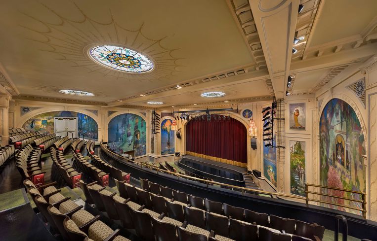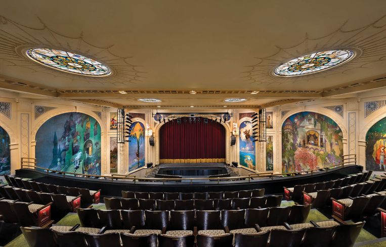 Katz and his crew were delighted to discover that a set of original fairytale castle-shaped chandeliers had been hidden in storage for 20 years. The painted red-roofed lanterns were cleaned, restored and hung on either side of the stage.
