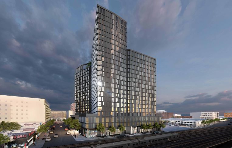 When completed the 24-story project will comprise 540,000 square feet and include 605 residential units; 424 units will be market rate and 181 will be mixed income. The development will also include 20,000 square feet of amenities including a movie screening room, a pet spa, rooftop space, a basketball court and a pickleball court.