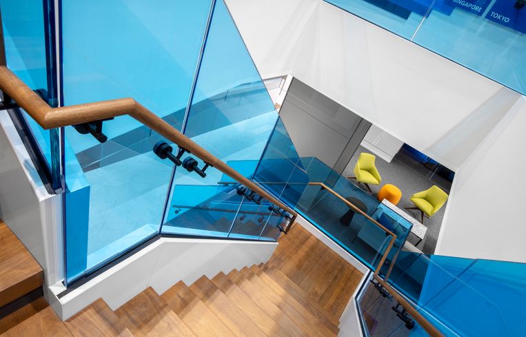 The royal blue of the company’s logo appears throughout the office, most notably as a translucent blue wall that surrounds a floating staircase connecting the two floors. It also makes an appearance in a bright blue carpet in a casual lounge area, on the long bench seat in the cafeteria, and as accent walls and carpets in the conference rooms.