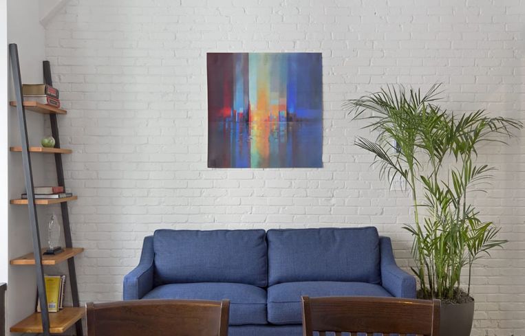 The reception desk is a 550-pound, custom-made piece of concrete imprinted with an overhead map of Midtown Manhattan and embossed with the letters “CNY.” One of CNY’s employees, an architect, decided to take an aerial map of Manhattan from 33rd to 62nd streets and First to 11th avenues and cut the buildings at 55 feet, so that the shapes of structures would be visible but their rooflines may not be. He teamed up with another employee to lay it out, and built a Styrofoam model of his proposal. Then the firm hired a concrete fabricator, TrueForm Concrete, to create a mold of the sculpture and pour the concrete.