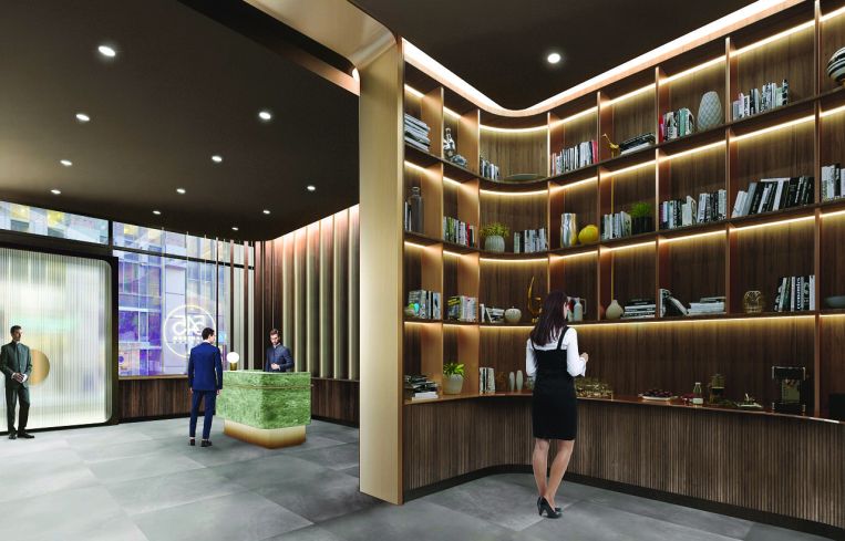 Even the lobby doors will be rounded and oversized “so they’re dramatic,” said Deitelzweig. The furniture will have rounded edges as well, with velvet couches in midcentury pinks and greens. Other accents include a blackened concrete wall and a bronzed mirror. There will also be fruit-infused water, jazzy music and Marx Realty’s “signature scent.”
