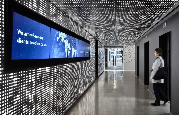 The amenity floor has large conference and training rooms, a cafe area with grab-and-go food options, and a 5,000-square-foot outdoor terrace with seating and a raised platform for fitness classes. This floor also has a striking elevator lobby for visitors and clients, which consists of a wall and ceiling clad in bright LED lights, on top of which a black, patterned metal panel has been layered. A 12-foot-long video screen with branded messages also faces the elevators.