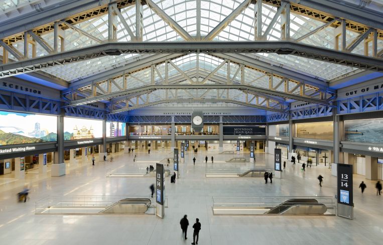 A team led by Skidmore, Owings & Merrill — which has shepherded the design of the project through multiple iterations since the late 1990s — breathed new life into the century-old building to create a 475,000-square-foot rail hub with retail. There’s an Art Deco-style clock designed by Peter Pennoyer Architects hanging in the center of the main room that looks like it would belong in any European train station.