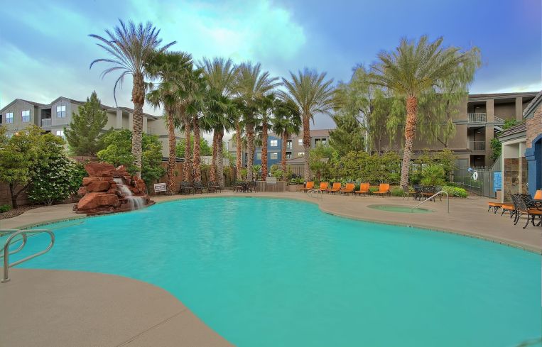 Located at 7955 W. Badura Avenue, the gated community is comprised of six apartment buildings, a leasing office/clubhouse and four garage buildings. Its amenities feature a pool, spa, business center, fitness room, and common lounge areas.