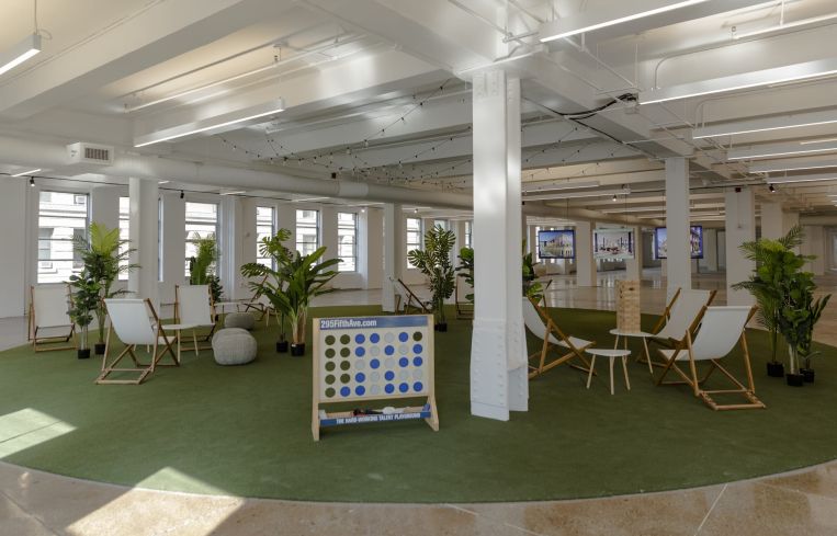 The emphasis on the fun is evident in the marketing floor, which features an area with fake grass, lawn games like corn hole, a big Jenga tower and an oversized connect four set, as well as swings.