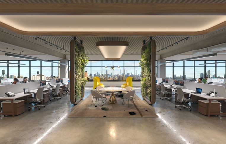Renderings of a potential buildout for the space show polished concrete floors, large windows, and suspended plant walls, as well as a warm, wooden accent wall behind a white oak reception desk and rounded hanging pendant lamps. Of course, the floor is currently empty and white-boxed, and the renderings just offer a potential design.