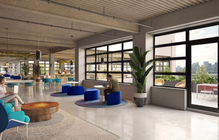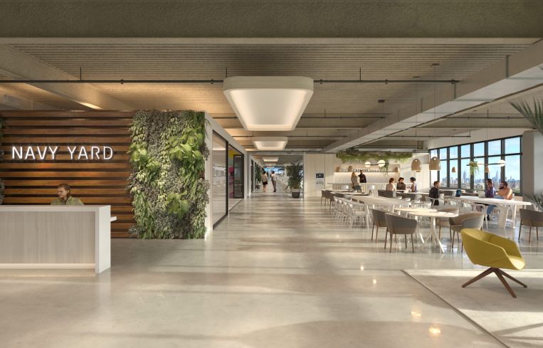 The Navy Yard’s renderings depict floor-to-ceiling windows and large, retractable glass doors separating the office from the terrace, though the space is currently outfitted with normal doorways. Asking rent is $35 a square foot. The 1 million-square-foot building also has a renovated ground floor with a food hall that includes Russ & Daughters, Transmitter Brewing and The Food Sermon.