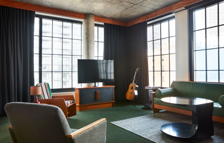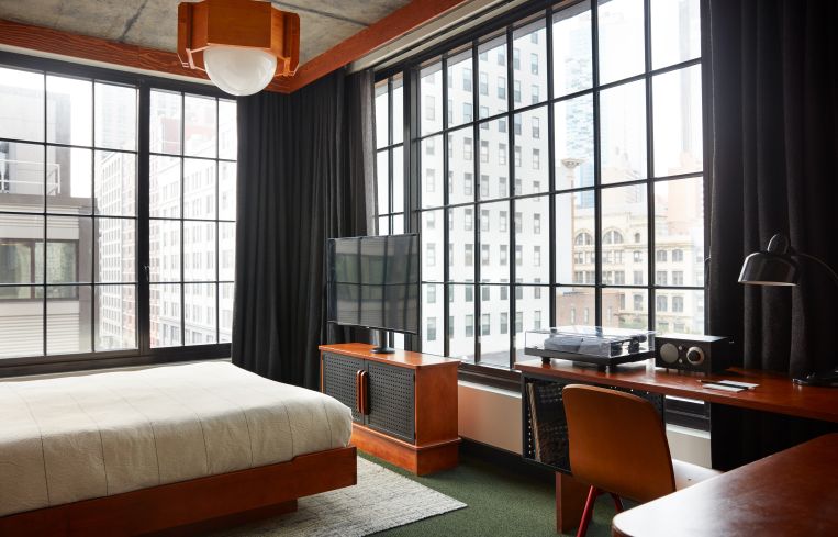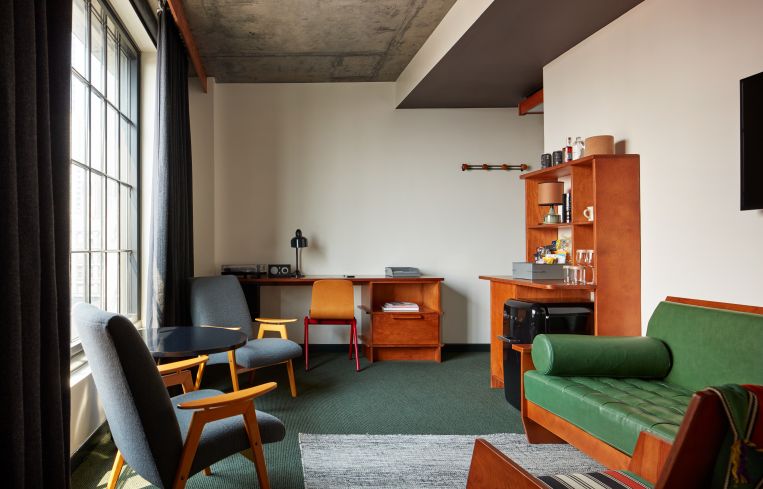 Roman and Williams also handled the interiors, and the look is certainly more mature than the mid-2000s look of Ace’s NoMad hotel. The ground-floor restaurant and bar features warm wood walls and wooden, midcentury modern tables to match green, leather-upholstered dining chairs and a large, abstract wall mosaic in green, yellow and red geometric shapes. Upstairs, the guest rooms have exposed concrete walls, warm wood finishes and furniture, including midcentury coffee tables, chairs and couches upholstered in greens and blues.