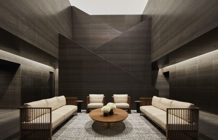 The 40-foot-tall entry hall, for example, is meant to resemble the courtyard of a Middle Eastern home. The space is ensconced in dark Saint Pierre Canadian limestone, which is also cut into a dramatic staircase leading up to the next level of the lobby. White linen and wood couches and chairs customized by Lebanese designer Nada Debs furnish the hall, which also features some dramatic white lighting along the black walls.
