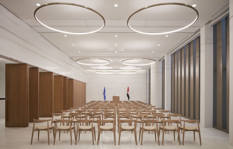 The fourth through sixth floors include offices and conference rooms for UAE’s diplomatic workers. Meeting rooms are enclosed in glass walls inscribed with patterns found on mashrabiya, which in traditional Islamic architecture are bay windows featuring elaborate wooden latticework.