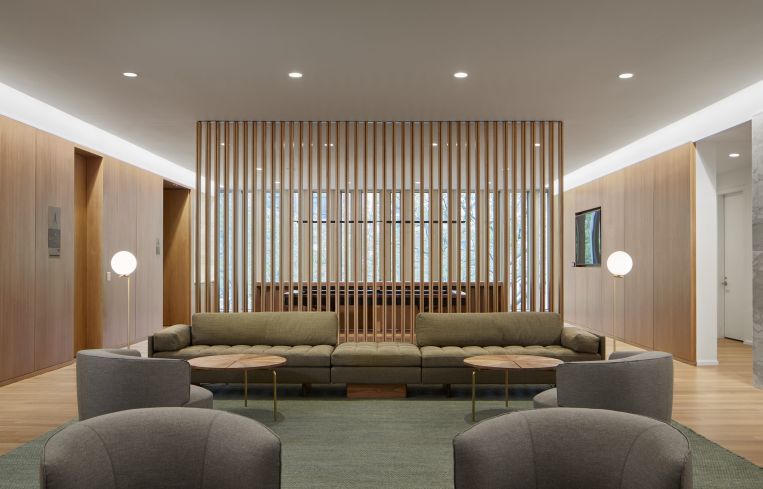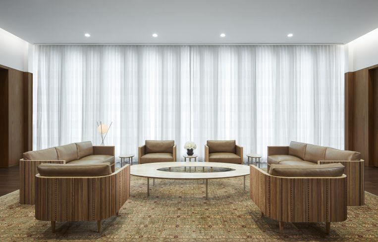 On the second floor is a bright white lecture hall lined with wooden chairs, arrayed for a press conference or a large gathering. The third floor is supposed to be an amenity floor, with lounges, a dining room, a library, a child care center and a pool table. The lounges incorporate midcentury modern seating, including olive green couches and upholstered soft gray chairs. Strips of walnut have been arranged into dividing screens to separate the different areas of the lounge spaces, and a long slab of white calacatta marble occupies one wall.