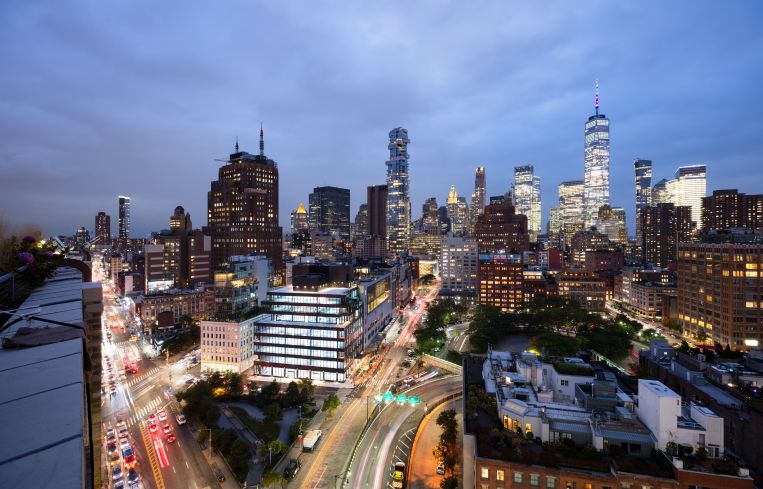 The metal-paneled exterior is an effort to blend with the industrial architecture of the three neighborhoods that surround the building — SoHo, Tribeca and Hudson Square.