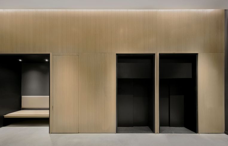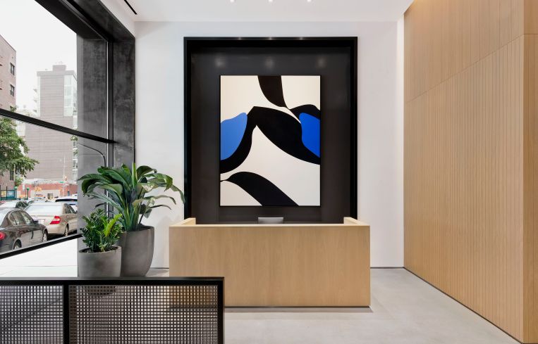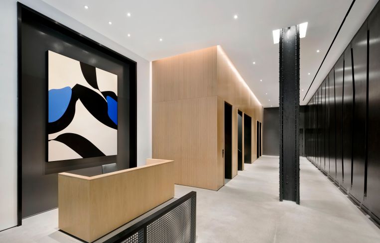 Fogarty Finger redesigned the dull, whiteboxed entry area with light wood paneling around the elevator bank, as well as a new matching wood reception desk. Behind the desk is a niche, painted black and hung with an abstract black, white, and bright blue painting by artist Senem Oezdogan, commissioned for this space. The work also involved exposing the structural columns, which have been painted black, and turning what had been an alcove for art along the elevator bank into a spot with a small, cream colored seat.
