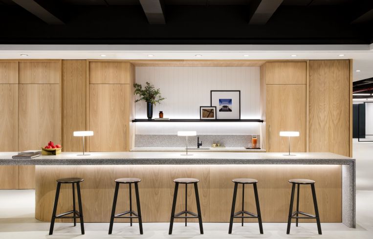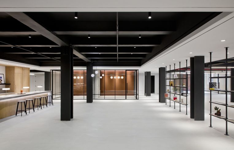 They also stripped the sheetrock off the building’s structural columns and painted them black too. Other additions include a new kitchen area with light wood cabinetry and a long terrazzo marble bar, two glassed-in conference rooms with burnt orange accent walls, round pendant lamps, and a floor-to-ceiling metal shelving unit that helps divide the desk work area from the communal part of the office.