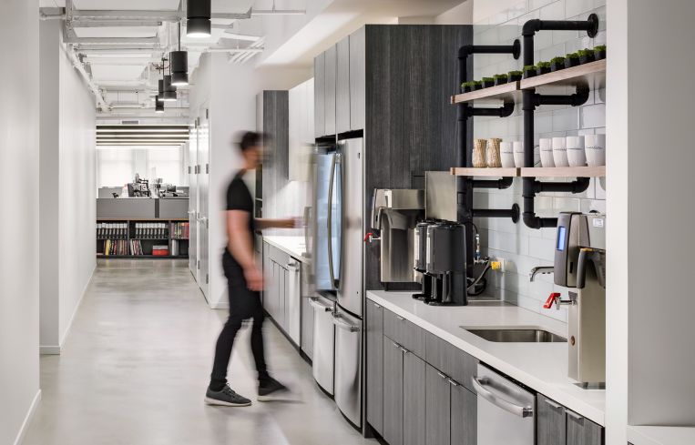 The space has a modern industrial feel, with polished concrete floors, a largely open layout, and a spacious kitchen that includes white subway tiling, gray wood-paneled cabinets, and wooden shelves suspended from the wall by black metal pipes. Even the wall of elevators next to reception is paneled with a vinyl wall covering that looks like corroded metal paneling.