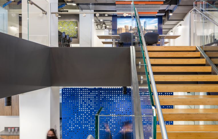 A large central staircase splits the office, linking large glass-paneled conference rooms, the main kitchen, executive offices, the majority of employee desks and a handful of small meeting rooms upstairs with a smattering of workstations and a few small conference rooms downstairs.