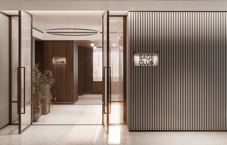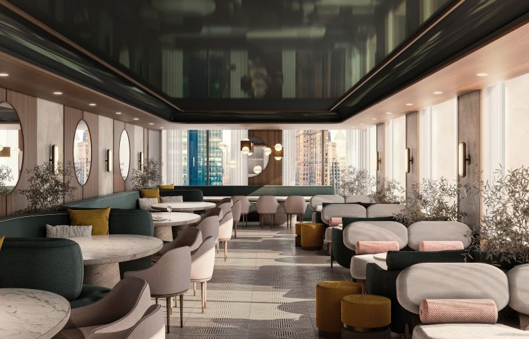 Sage tapped Fogarty Finger to design a 12,000-square-foot amenity space on the 14th floor of the building between East 49th and East 50th streets. Called “Sage Club,” the new amenity portion includes a midcentury modern-style dining area and event hall with two walls of large windows, a reflective dark green-lacquered ceiling, dark green bench seats and marble tables. The space, which includes access to the 9,000-square-foot terrace upstairs, overlooks the corner of Madison Avenue and East 50th Street.