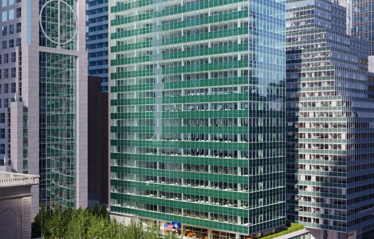 The 260,000-square-foot structure has a unique footprint, with a three-story podium topped by a large outdoor terrace, and the tower portion set back from the street and positioned at a right angle to Park Avenue.