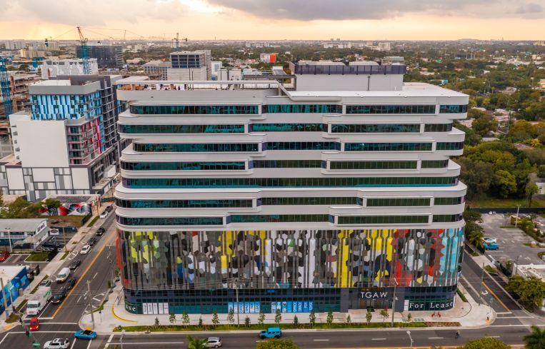 The property offers 24,000 square feet of retail space on the ground floor and 195,000 square feet of office space. Corporate tenants include tech startup OpenStore and biopharmaceutical company Veru.