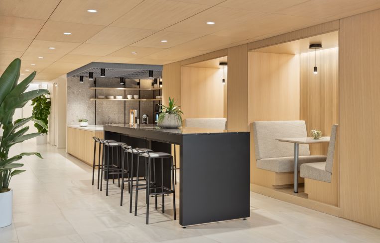 The lobby of the building was also renovated. The landlord, DivcoWest, wanted to keep as much of the existing lobby as possible. So Vocon resurfaced the Japanese oak walls, recladded the reception desk in black marble, and added a seating area with a fabric tapestry that hangs from the ceiling and swings as air moves through the space. There is also an inner lobby — which tenants can access with their keycards through a set of double doors — which was renovated with new wall art, more seats and café tables, and a “refresh bar” with free fruit and bottled water.