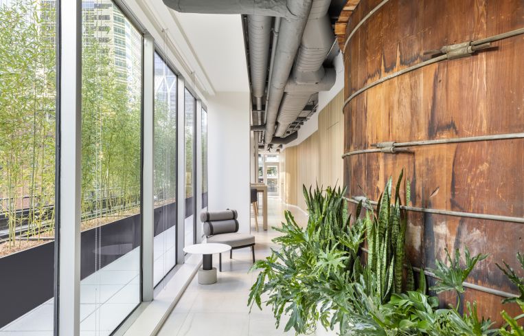 Upstairs, the lounge spaces are smaller and narrower because more of the floor is occupied by mechanical equipment. There’s another coffee bar, a few small, casual meeting areas and a 1,500-square-foot outdoor terrace with seating and a pergola. The eponymous wooden water tower juts out into a hallway, its rounded, worn wood surface now fronted with plants. There are also locker rooms, which have a boutique gym feel with blonde wood lockers and gray terrazzo stone in the showers.