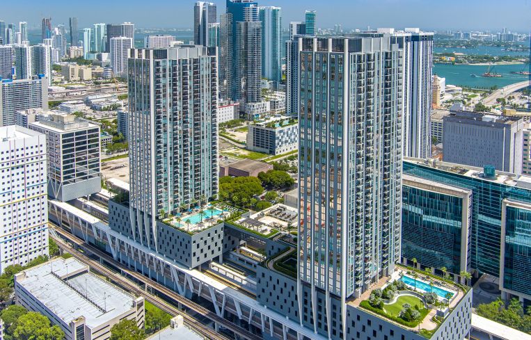 ParkLine Miami sits at 100 NW 6 Street, directly above MiamiCentral. Completed in 2020, the complex includes 816 units in two luxury residential towers — one 44 stories and the other 47 stories. Resident amenities include infinity and swimming pools, running track, fitness centers and coworking spaces.