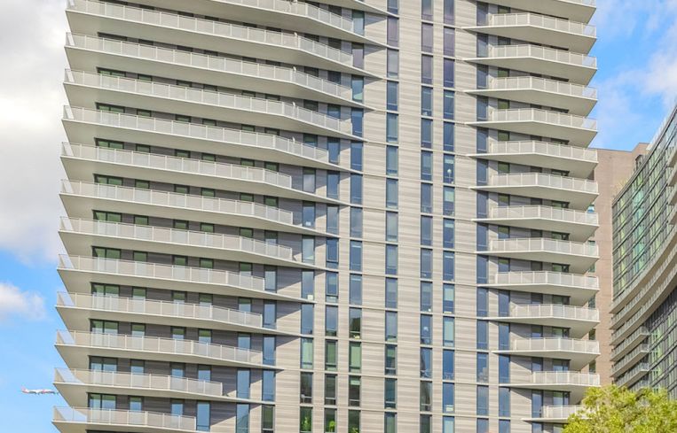 The property is a LEED Gold Certified community and offers studios to three-bedroom units, penthouses, and two-level townhomes. Amenities include a rooftop sky lounge and pool.