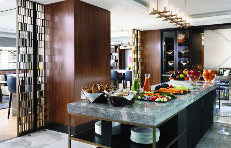 The space is midcentury-inspired with round, off-white armchairs and couches, floor-to-ceiling dark wood bookshelves, and gold-accented light fixtures and furniture. There are smaller wooden cocktail tables as well as counter-height Italian marble tables. Floor-to-ceiling golden metal screens help separate the lounge from the kitchen pantry, where a long marble countertop serves as the staging area for breakfast. Langham staff set out a cold and hot breakfast buffet every day, and a chef is on hand cooking eggs to order.