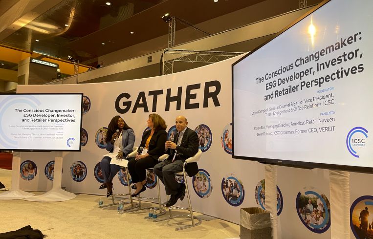Lesley Campbell, general counsel and senior vice president of talent engagement & office relations at ICSC, moderated the panel titled “ESG Developer, Investor and Retailer Perspectives.” Speakers included Sharon Bair, managing director of Americas retail at Nuveen, and Glenn Rufrano, ICSC chairman and former CEO of VEREIT.